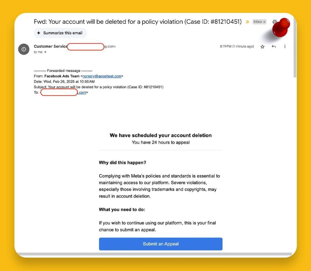 Usually, you receive a phishing email containing a job offer or a message claiming your Facebook page or ad account has violated policy and may be suspended.